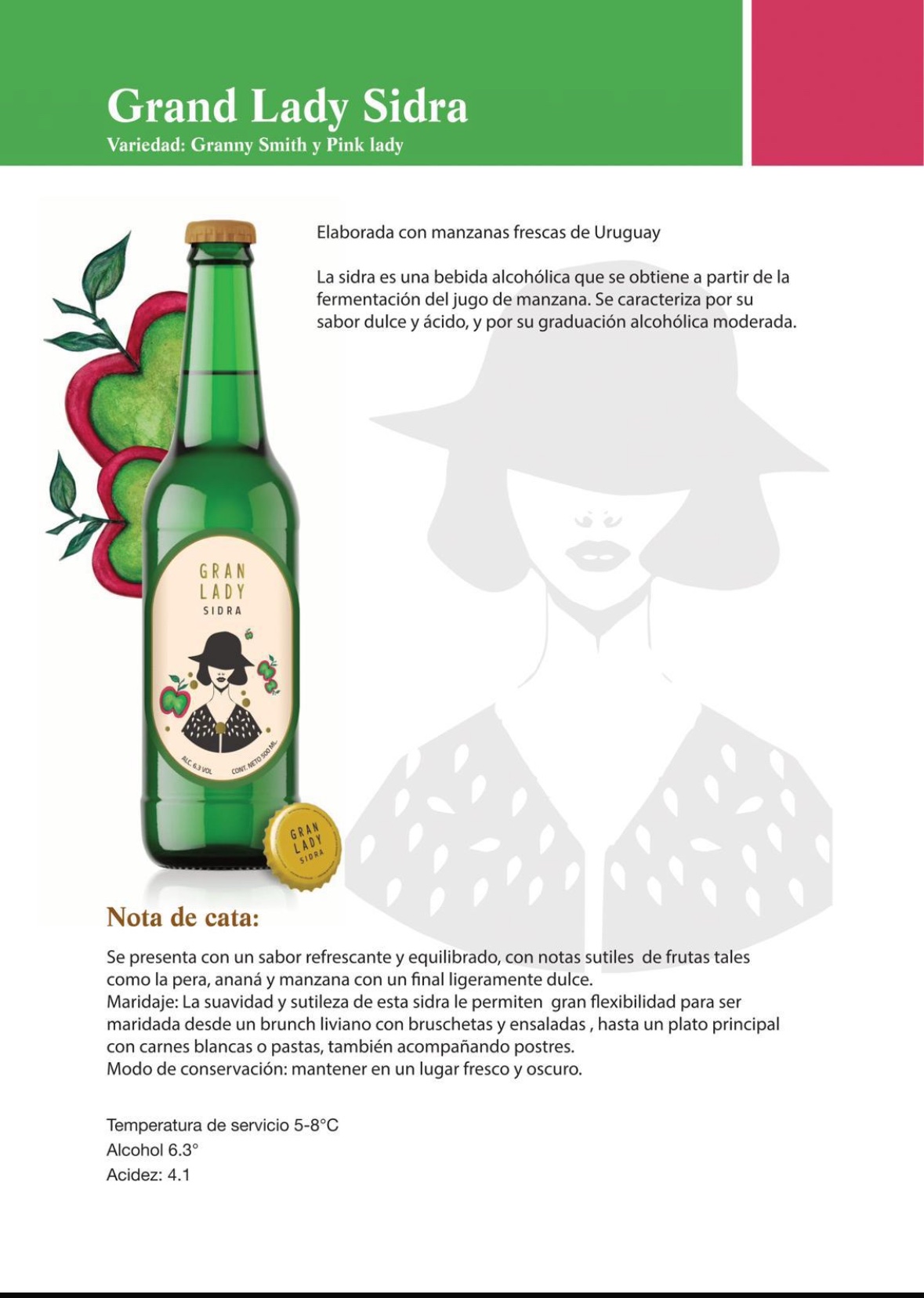 Hecha con manzanas frescas Granny Smith, la clásica manzana verde, ácida, y la Pink Lady, la roja, super jugosa , ambas de los mejores huertos de Uruguay, ofrece un sabor refrescante y equilibrado, con notas sutiles de frutas y un final ligeramente dulce. Maridaje: La suavidad y sutileza de esta variedad le permiten gran flexibilidad para ser maridada desde un brunch liviano con bruschetas y ensaladas, hasta un plato principal con carnes blancas o pastas, también acompañando el postre.